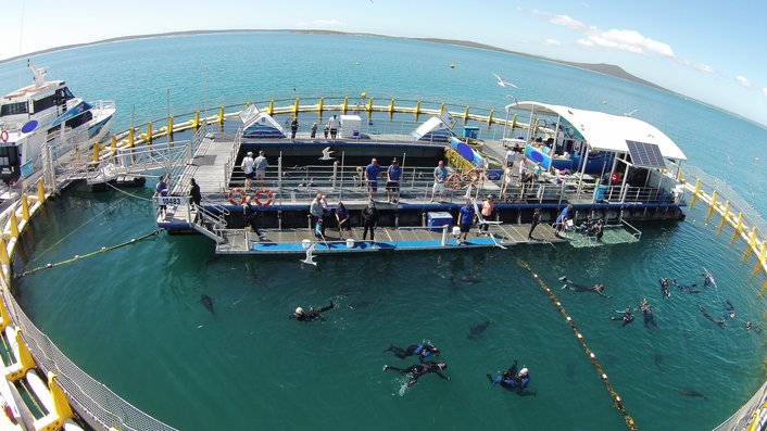 A quick trip on our luxurious catamaran will deliver you to the Oceanic Victor in-sea aquarium sheltered in the lee of Granite Island. Once you arrive you will be fitted out in a warm wetsuit with mask, booties and gloves, and then into the water to swim with the Southern Bluefin Tuna.